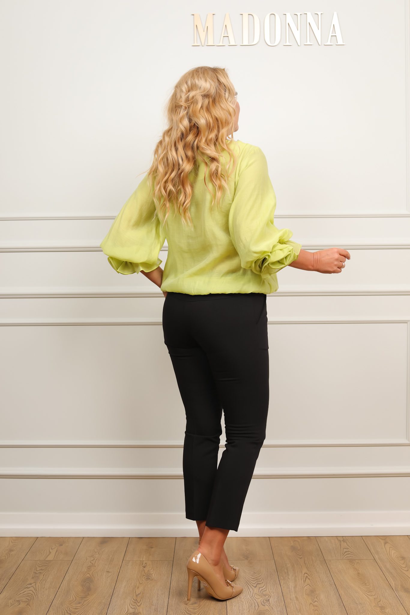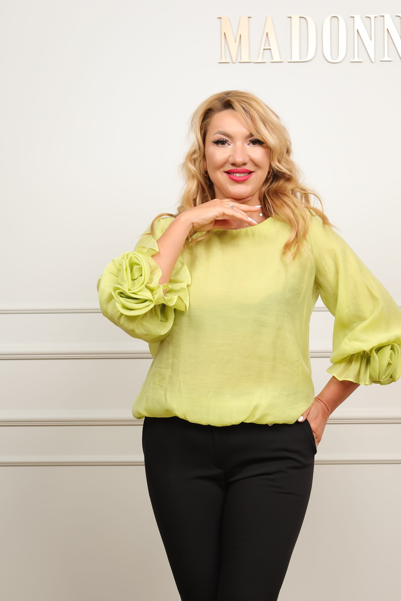 Accesorizata cu  trandafir la maneci, maneca bufanta, tulle pe dedesupt.