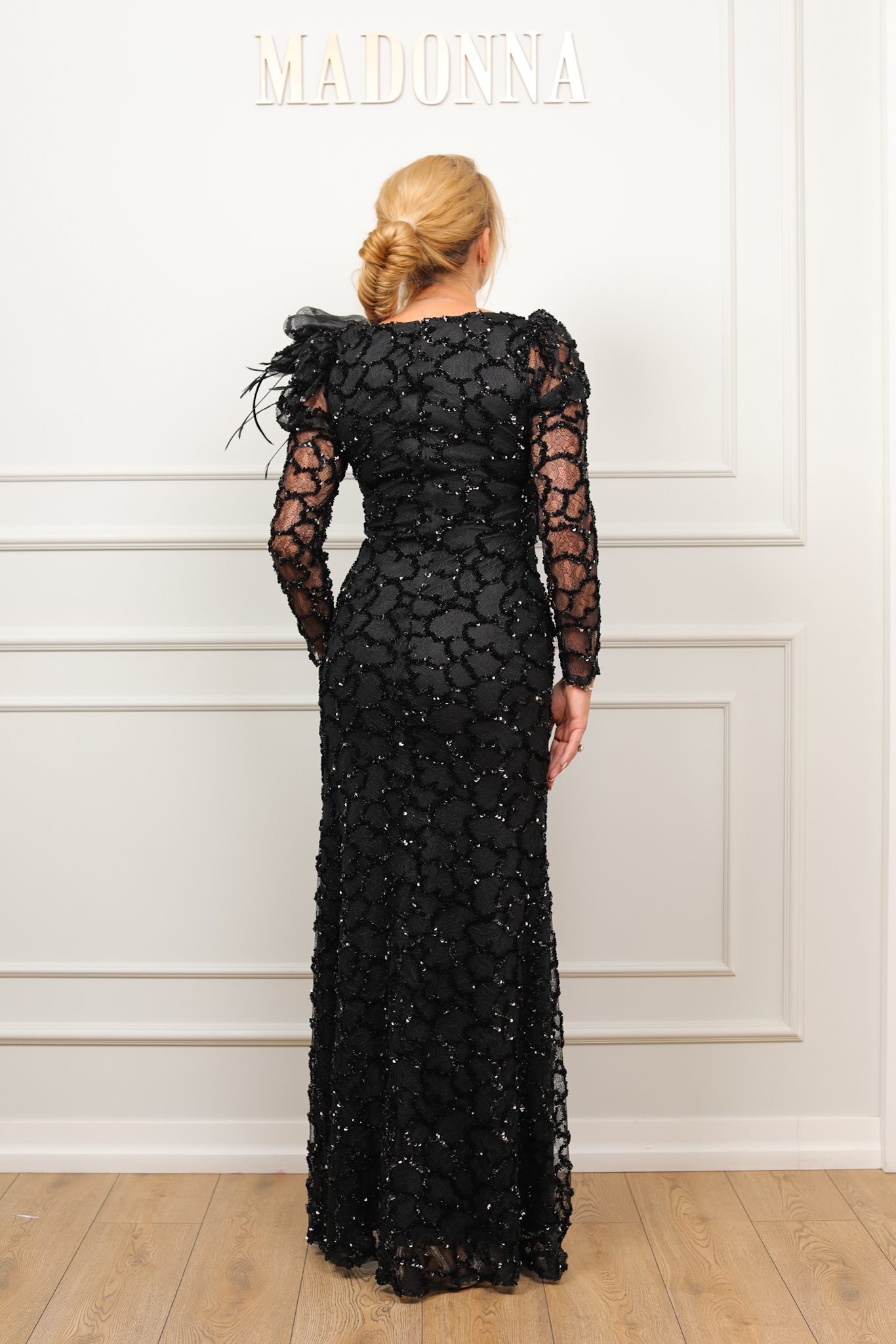 Model din paiete cu slit in fata , maneca lunga , floare detasabila pe umar .