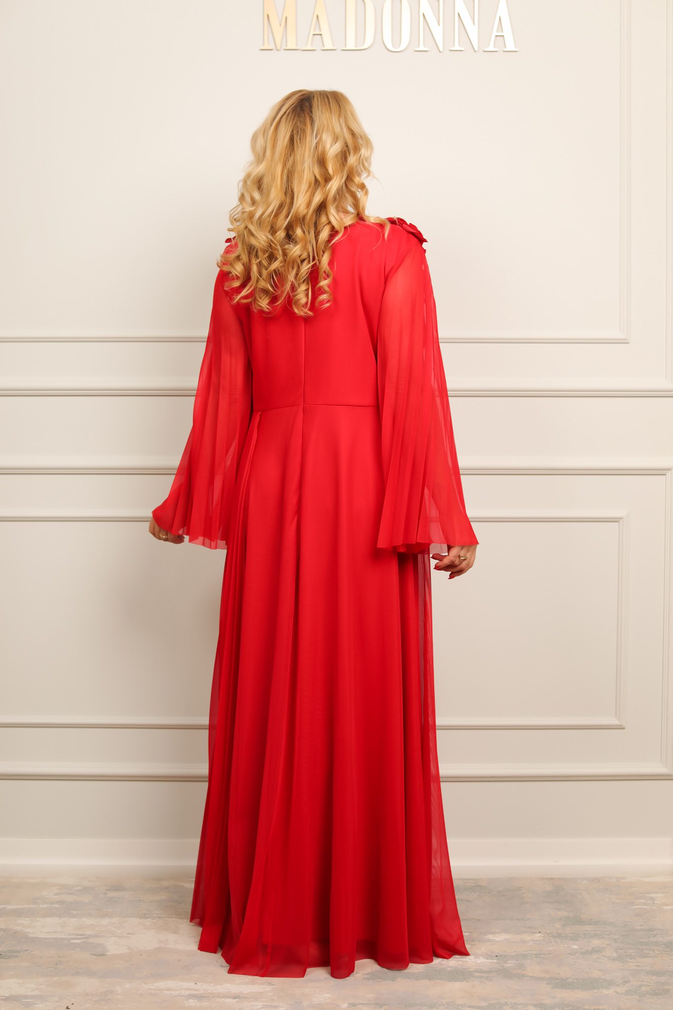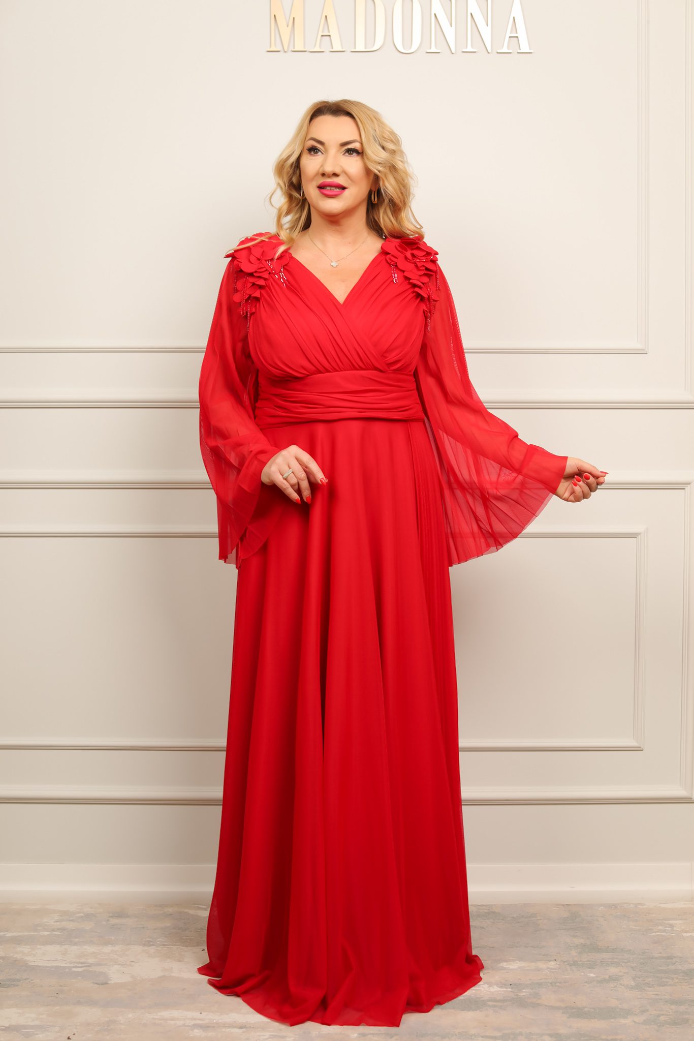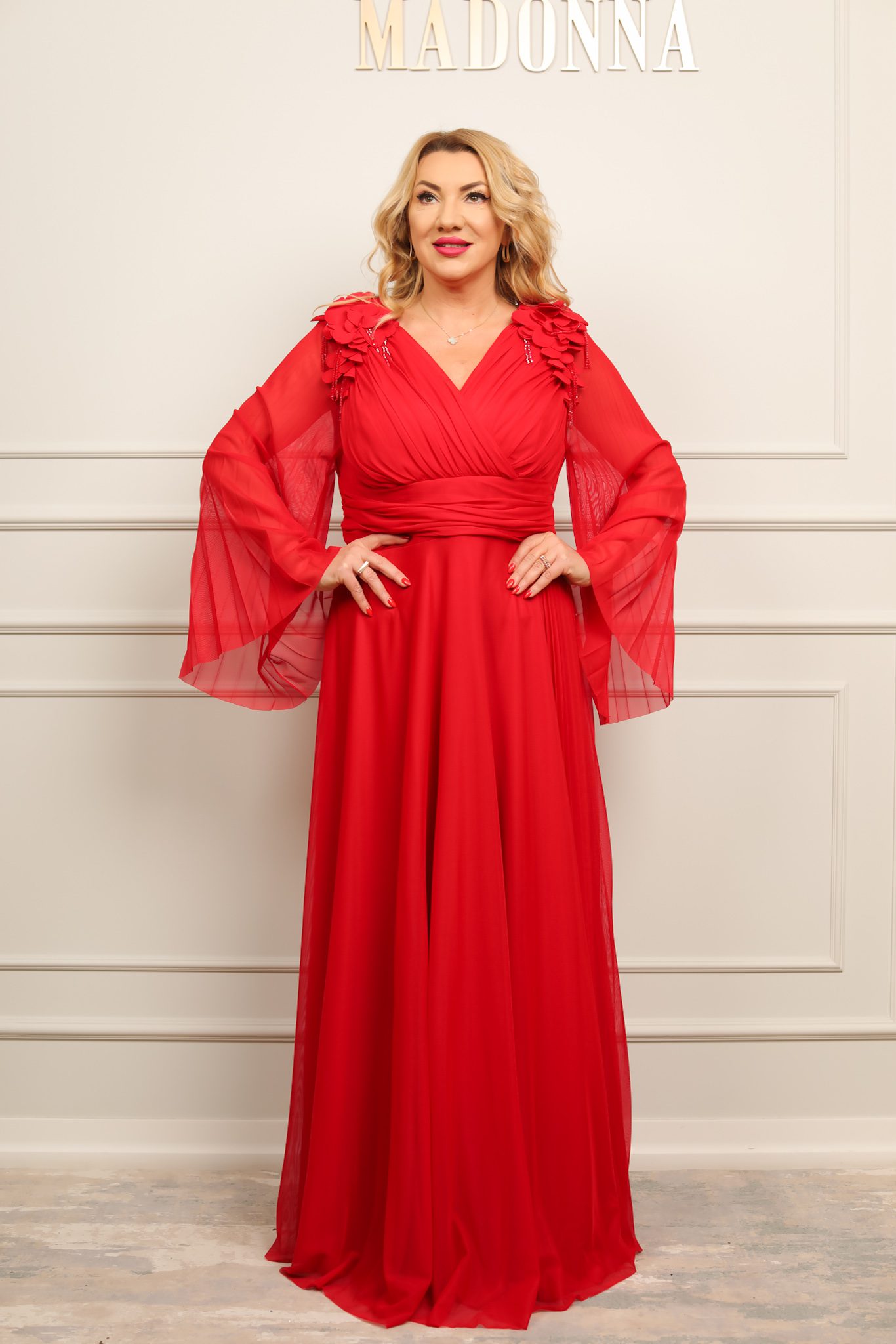 Rochie lungă elegantă, din material vaporos, cu decolteu petrecut și talie evidențiată, ce pune în valoare silueta. Mânecile fluide și aplicațiile florale de pe umeri adaugă un aer feminin și rafinat, fiind alegerea perfectă pentru evenimente speciale.