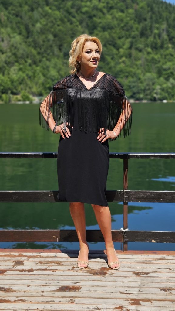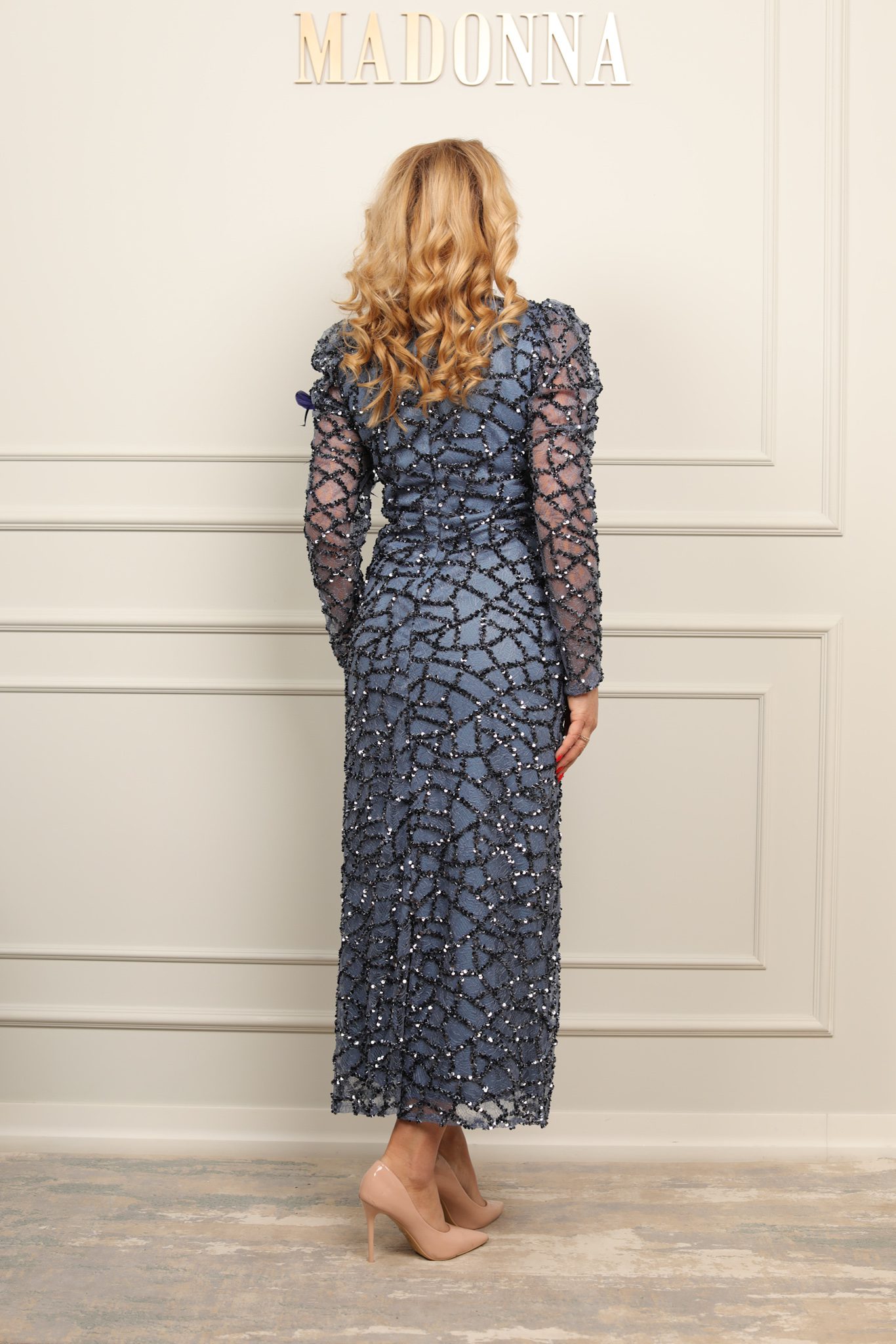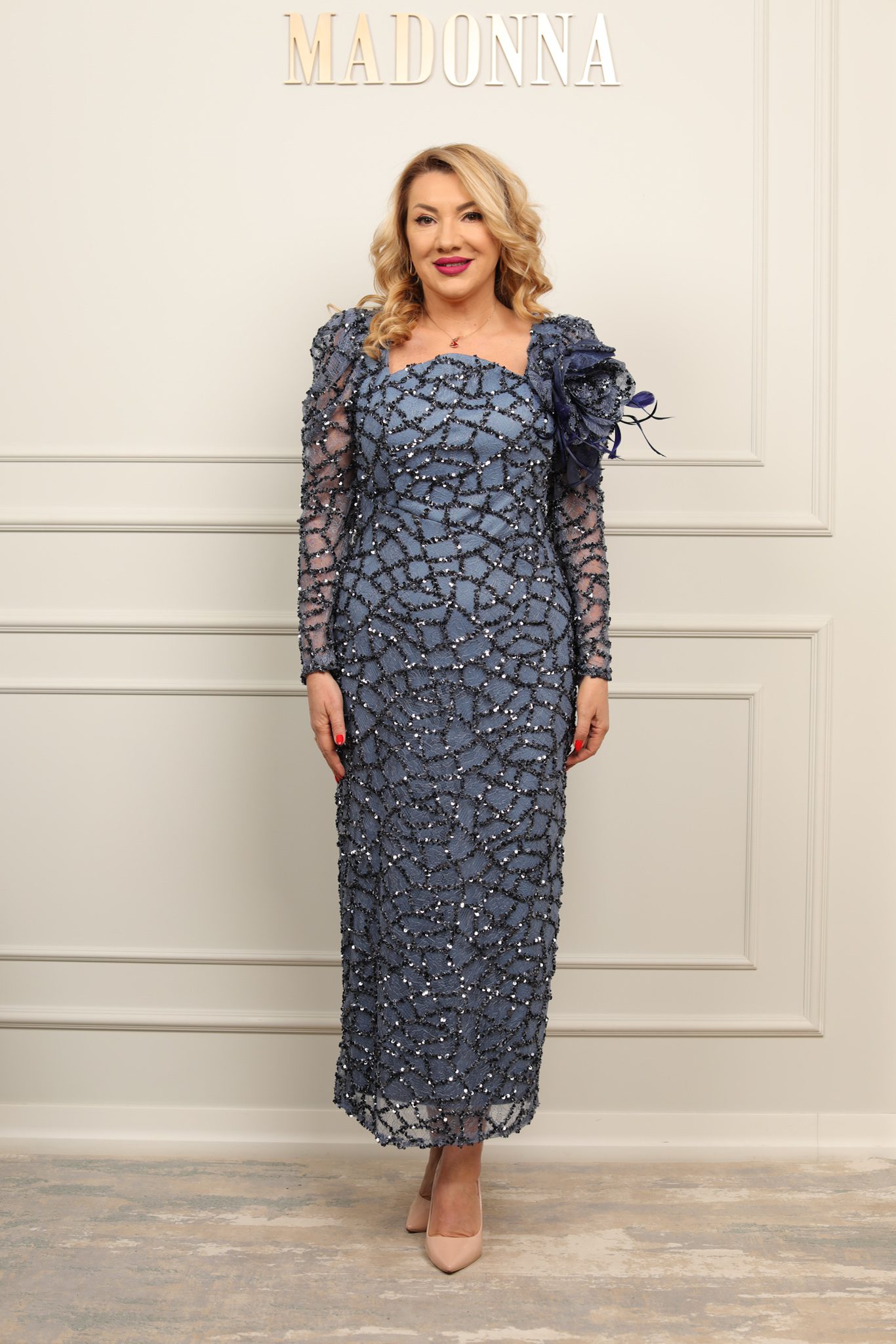 Rochie elegantă midi, cu croială feminină ce evidențiază silueta, realizată din material fin cu aplicații strălucitoare. Mânecile lungi transparente și detaliul floral de pe umăr adaugă un plus de rafinament și eleganță, fiind alegerea perfectă pentru evenimente speciale.