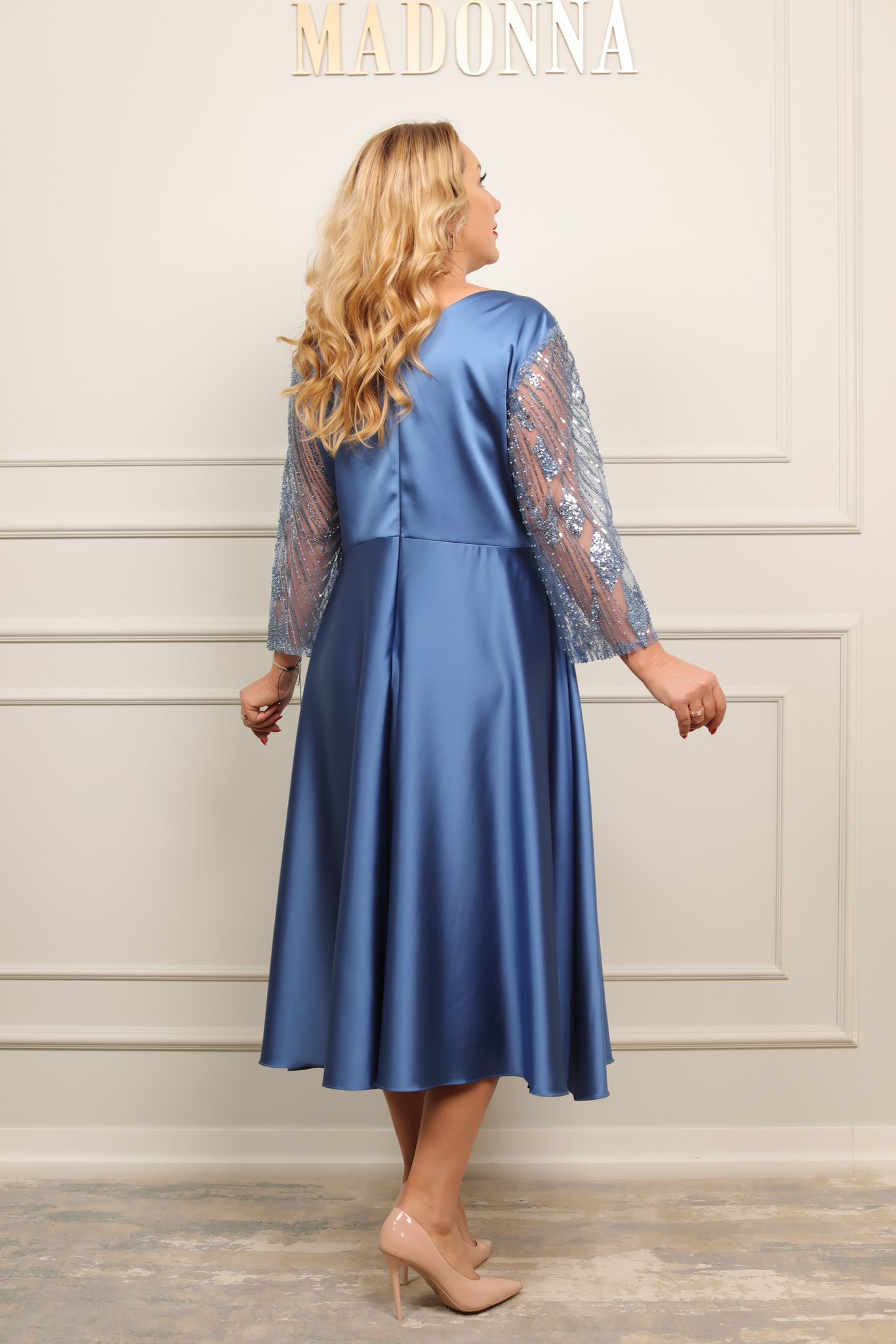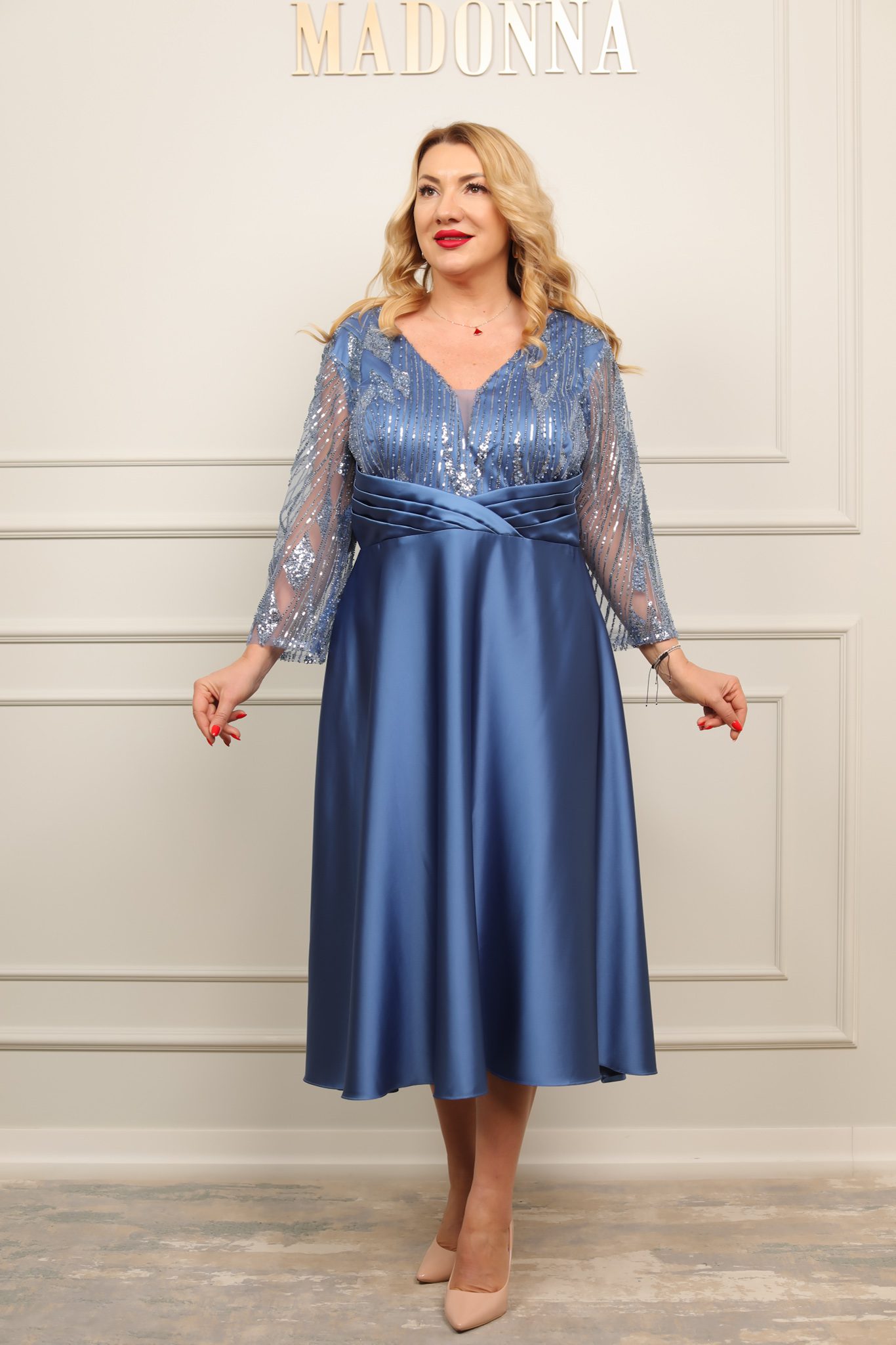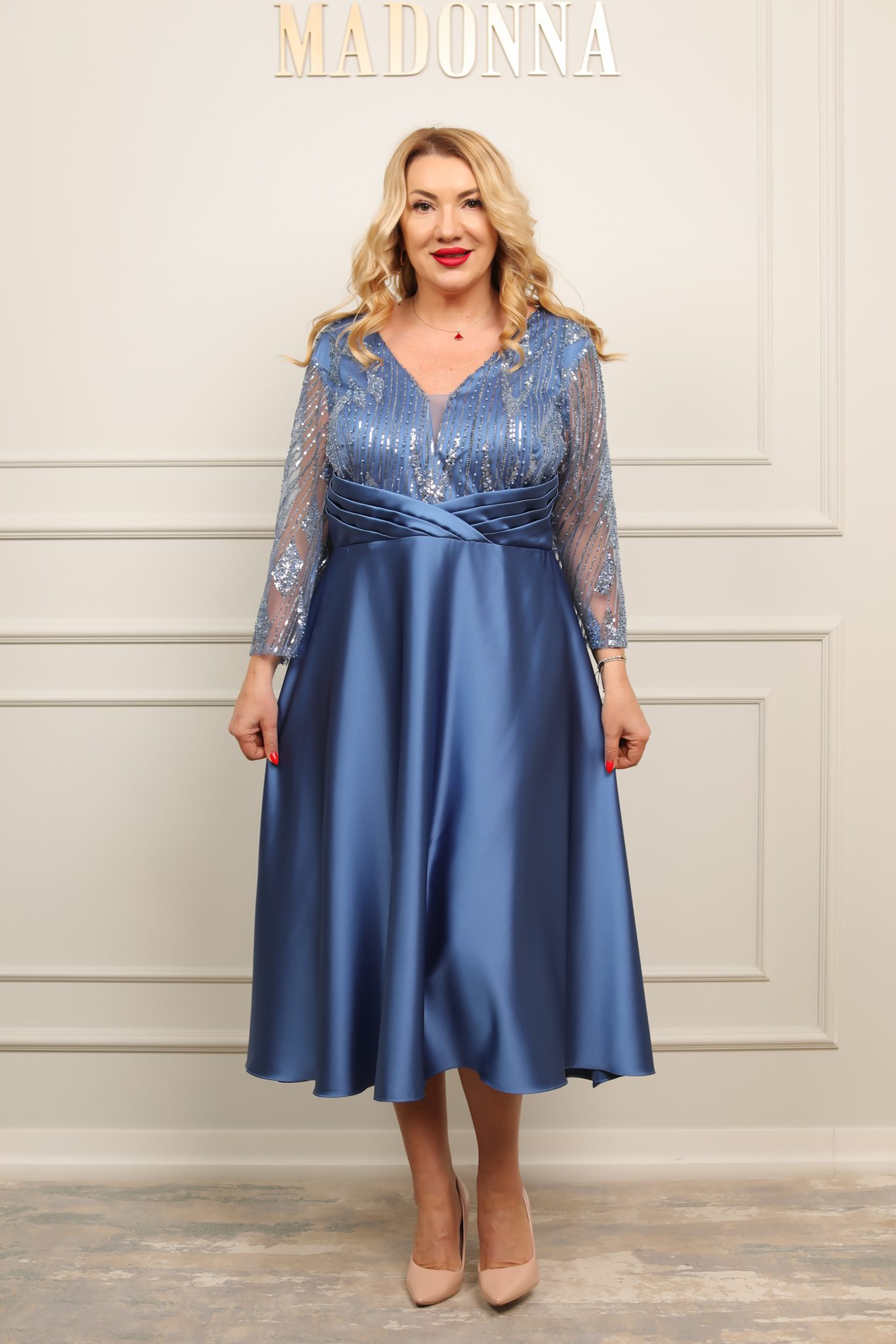Rochie elegantă midi, cu bust din paiete fine și mâneci transparente, completată de o talie marcată cu drapaj satinat. Fusta amplă din material fluid oferă lejeritate și rafinament – ideală pentru evenimente speciale.