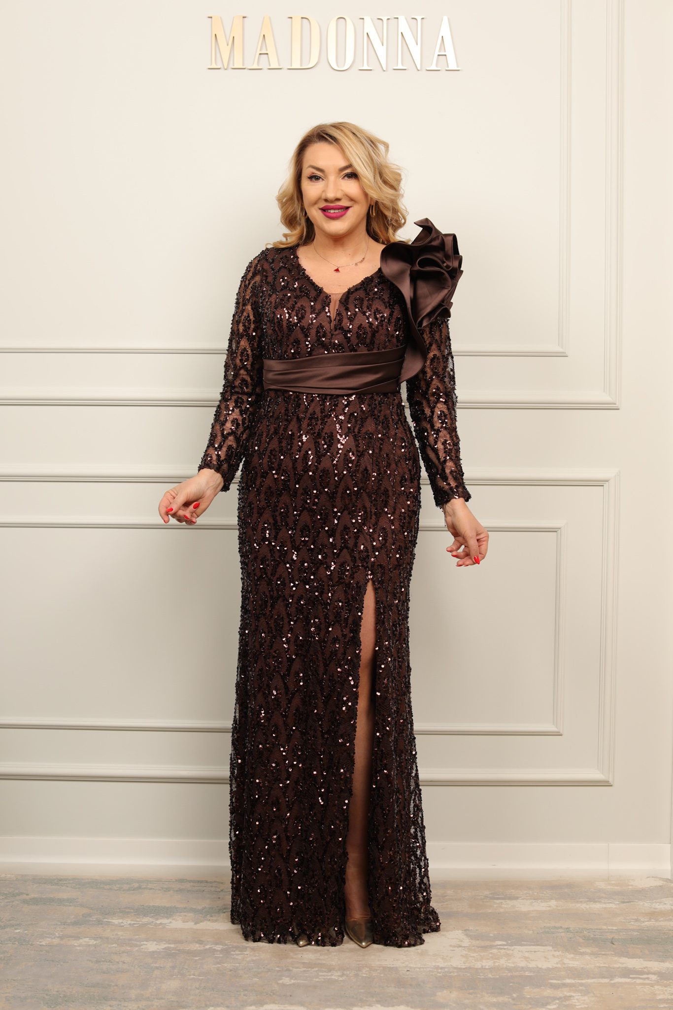 Rochie lungă elegantă, cu croială sofisticată și detalii strălucitoare ce atrag subtil privirea. Mânecile lungi, talia evidențiată și aplicația voluminoasă de pe umăr oferă un aer rafinat, iar slitul frontal adaugă feminitate și eleganță, perfectă pentru evenimente speciale.
